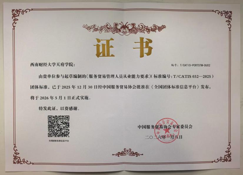 近日,由中國(guó)服務(wù)貿(mào)易協(xié)會(huì)組織起草的團(tuán)體標(biāo)準(zhǔn)《服務(wù)貿(mào)易管理人員從業(yè)能力要求》(標(biāo)準(zhǔn)編號(hào):T/CATIS 032—2025)經(jīng)批準(zhǔn)正式發(fā)布,并將于2026年5月1日起在全國(guó)范圍內(nèi)實(shí)施。西南財(cái)經(jīng)大學(xué)天府學(xué)院智能金融學(xué)院作為該標(biāo)準(zhǔn)的重要參編單位之一,全程參與了標(biāo)準(zhǔn)的調(diào)研、起草與論證工作,為推動(dòng)我國(guó)服務(wù)貿(mào)易行業(yè)人才規(guī)范化、專業(yè)化發(fā)展貢獻(xiàn)了高校智慧與力量。該...